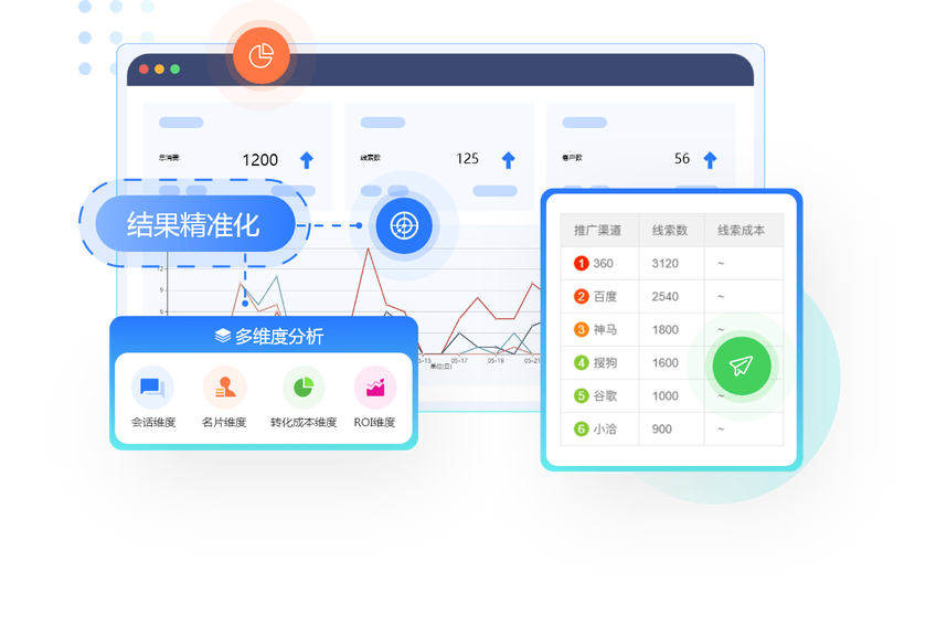 从会话、线索、转化成本、ROI等维度呈现推广情况变化趋势数据打通,细化管控能力,纵向对比不同渠道效果,横向对比不同投放结果,辅助推广人员精准优化推广模型。